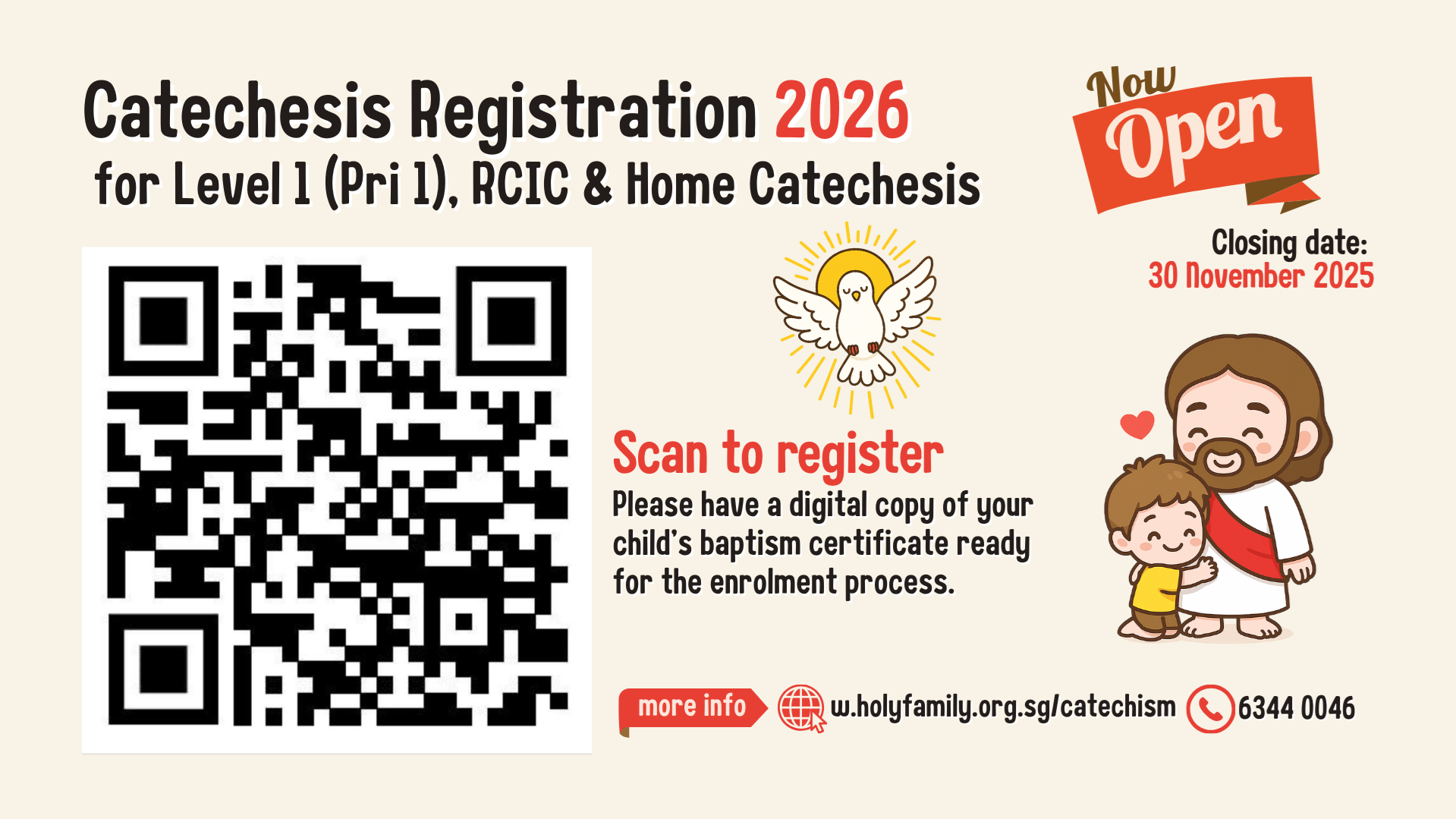The registration for our 2026 Catechesis programme is officially open. We welcome enrolments for Level 1 (Primary 1), Home Catechesis, and RCIC (Rite of Christian Initiation for Children).