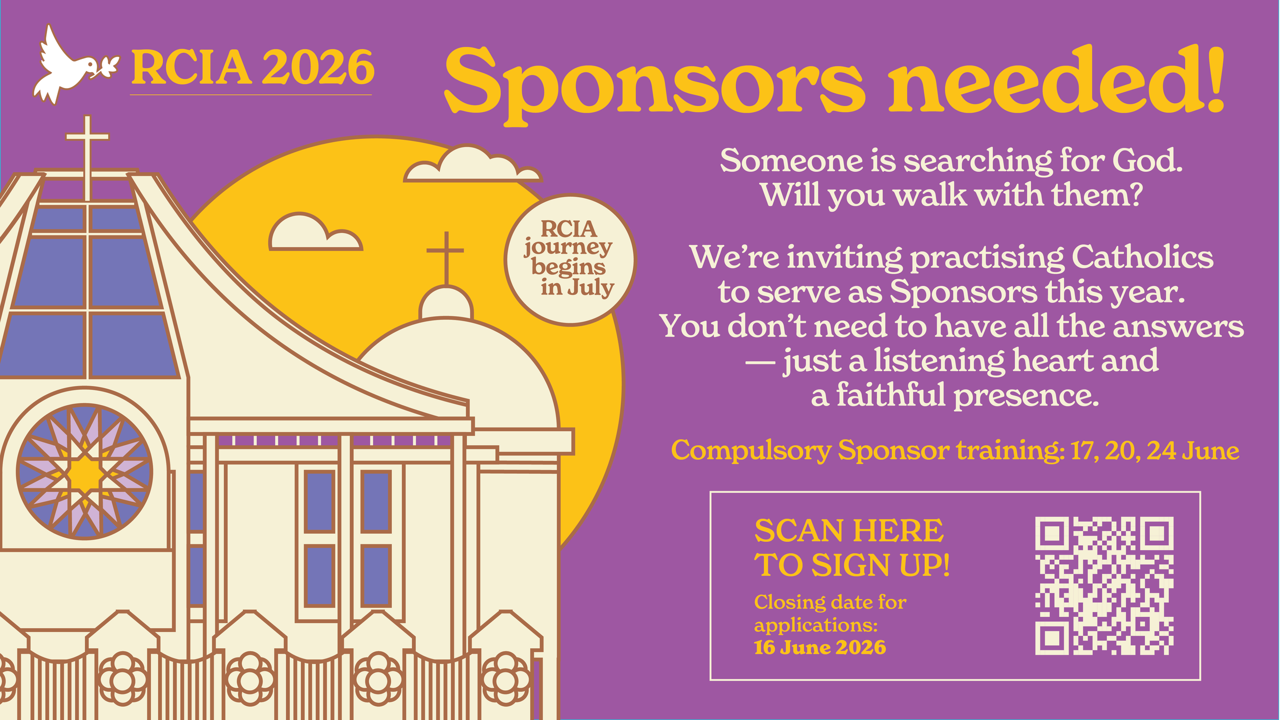 Compulsory Sponsor training will be held on 17, 20 and 24 June. Visit https://w.holyfamily.org.sg/rcia to find our more about our RCIA program and sign up as a sponsor.