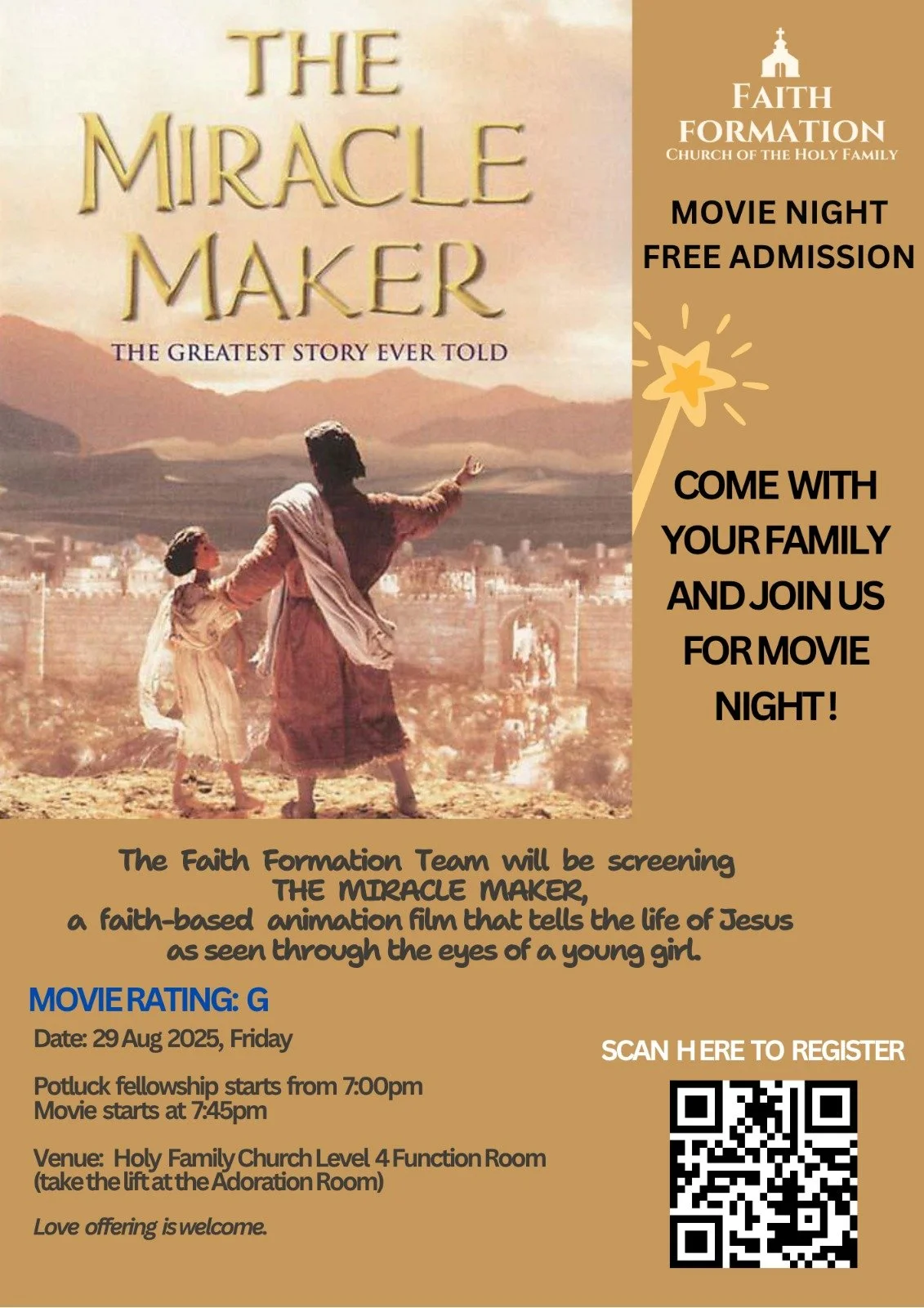Join the Faith Formation Team for a free screening of "The Miracle Maker," a profound claymation film on the Gospel story. Fri, 29 Aug, 7:00 PM potluck, 7:45 PM movie, Holy Family Church Level 4. Register here.