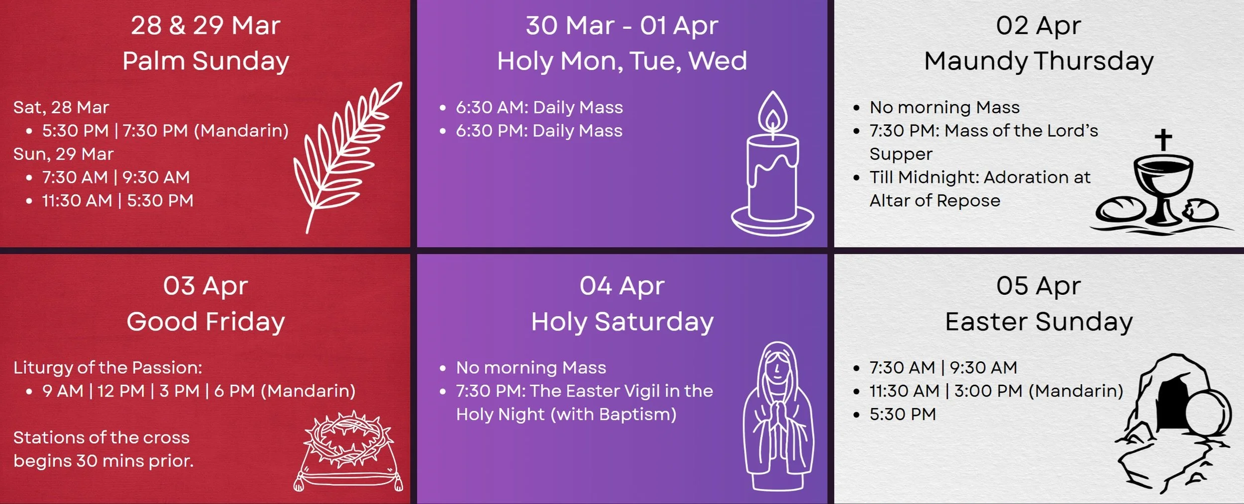 We invite you to come for one of the mass or services during these days. Even a short time — simply being present — is a way to join this journey.